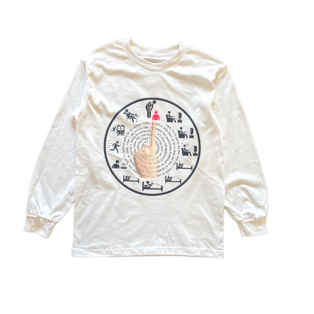 朝、目が覚めた瞬間に悟る「あ、終わった」というあの感覚。そこから始まる絶望の全力疾走、駅のホームでの息切れ、そして汗だくで現れて「申し訳ございません!」と頭を下げる……。でも、ちょっと待ってください。結局怒られるのが「確定演出」なら、そこまで必死になる必要、本当にあるのでしょうか? 馬鹿正直にボロボロになって怒られるより、優雅にお茶の一杯でもしばいて、整った心で「お待たせしました」と現れる。これこそが、現代人に必要な究極のライフハックであり、ある種の知的なタイムマネジメントではないでしょうか。どうせマイナスなら、その時間を最大限に「自分」のために使う。その開き直りこそが、人間としての余裕を生むのです。 デザインには、そんな「遅刻をめぐる葛藤のサイクル」を円の中に閉じ込めました。ゲーム、熟睡、寝坊、焦り、全力疾走、ティータイム、そしてお説教……。中央の大きな指が指し示すのは、逃れられない現実か、あるいは「ゆっくり行こうぜ」という新しい哲学か。印象的な差し色のピンクは、開き直った人間だけが持つ、清々しいほどの「心持ち」の輝きを象徴しています。目の前の方は黒く澱んでません、ピンクの可愛い存在です。 この「どうせ遅刻すんならゆっくり行こう」ロンTを纏えば、不思議と足取りは軽くなるはず。「私は今、遅刻という時間を有効活用しているのだ」という謎の自信を胸に、一歩一歩踏み締めて現場へ向かいましょう。 大丈夫、ダメなのは、怒られるのは、もう決まっているんですから。