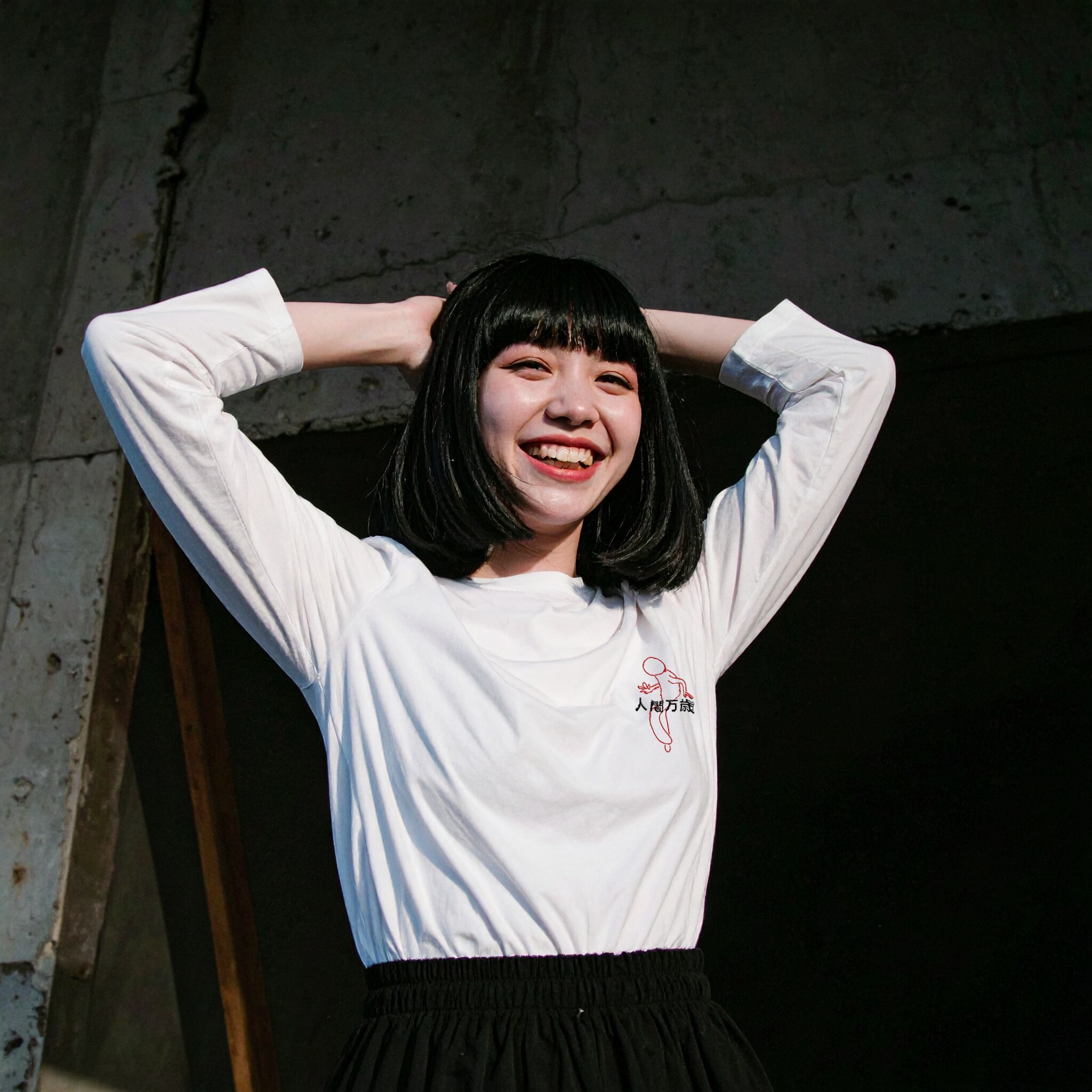左胸に「人間万歳」のロゴと人間が踊る、ブランドを象徴する長袖Tシャツ。派手すぎず、さりげなく人間万歳と主張する、上品なデザインが魅力です。