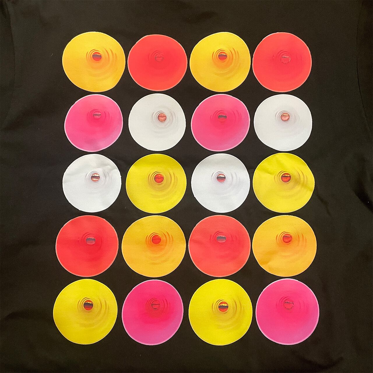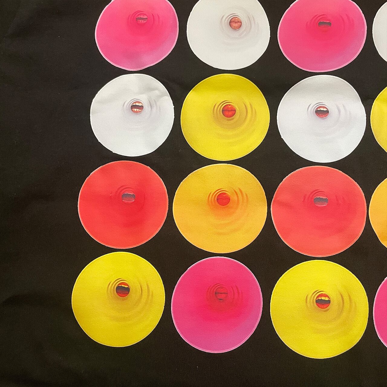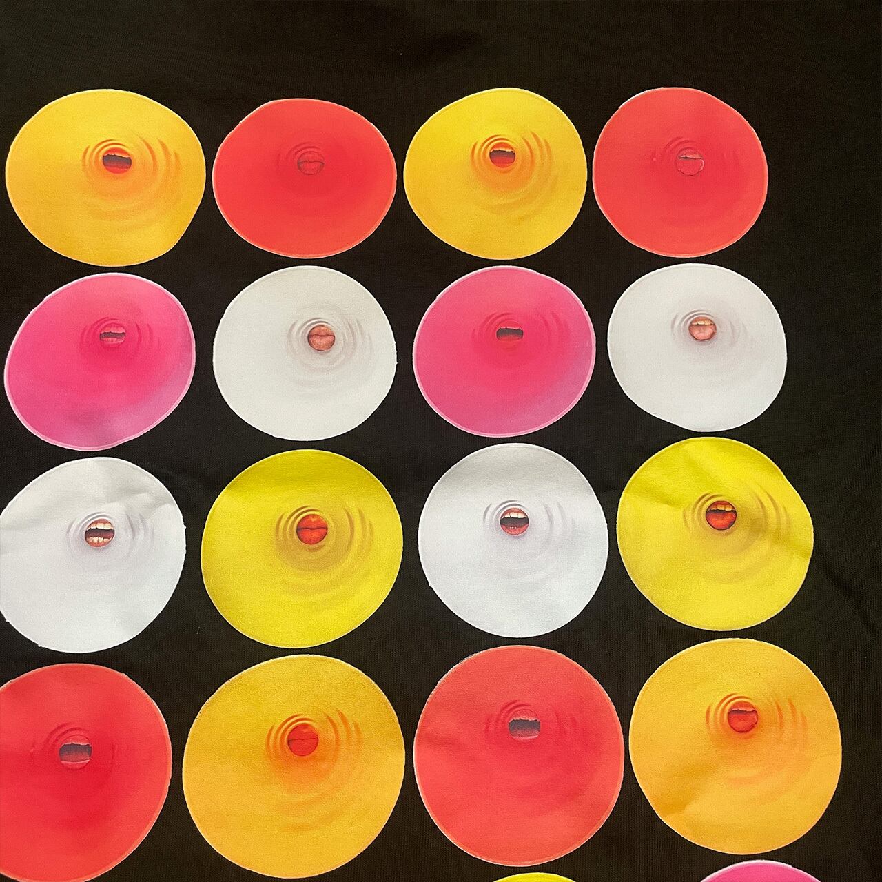 カラフルでポップな円の中心に浮かび上がる気色の悪い口が印象的です。
