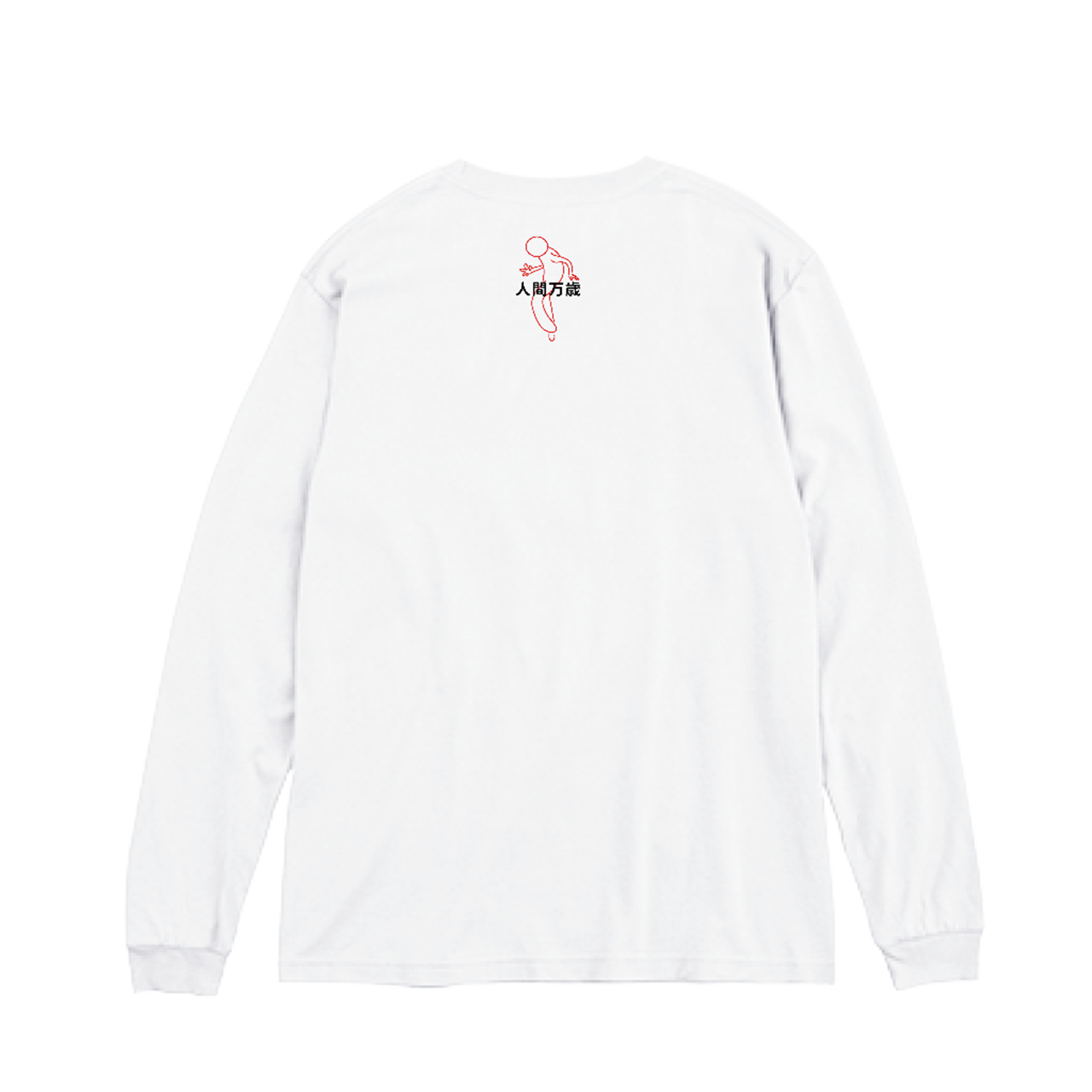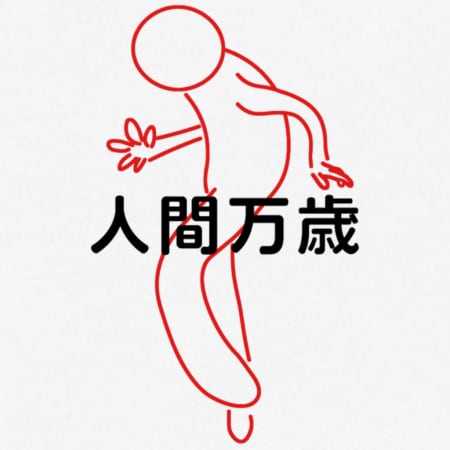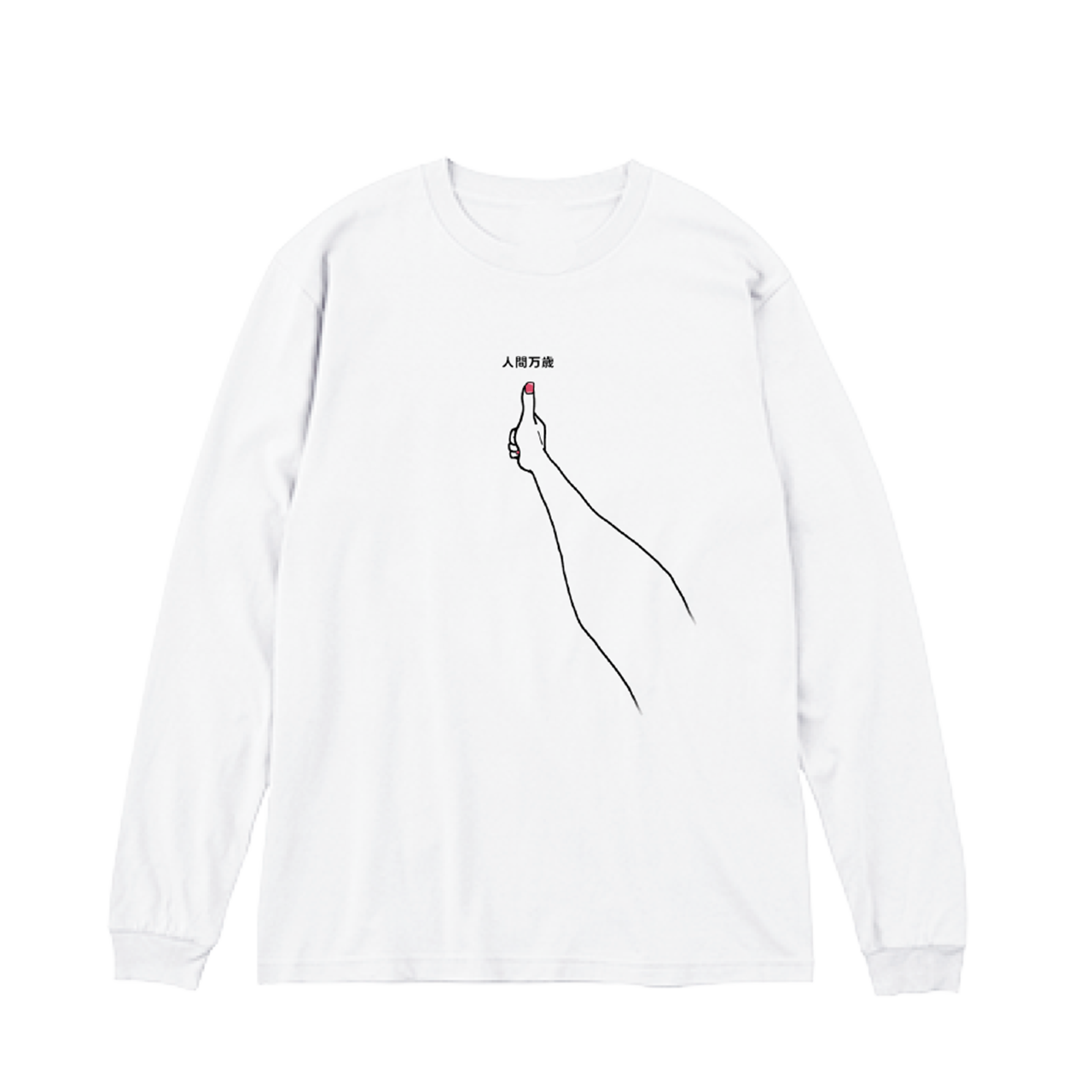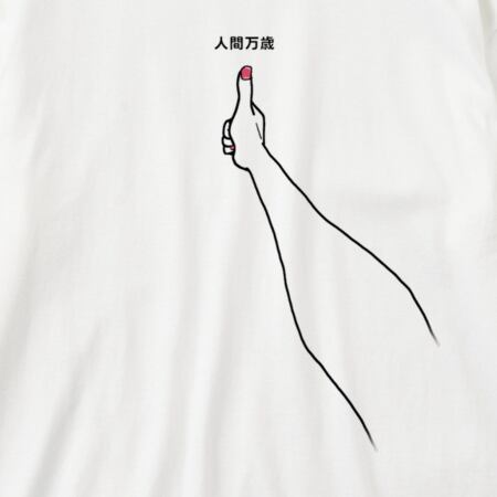 「人間万歳」の文字に向かって、力強く突き出された親指。 いいねのグッドポーズ!